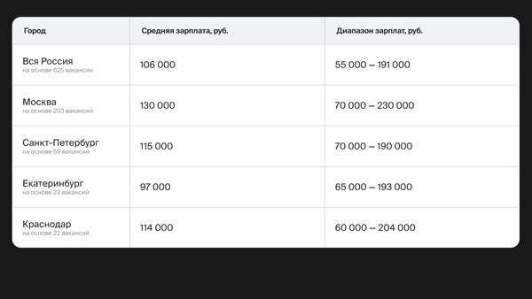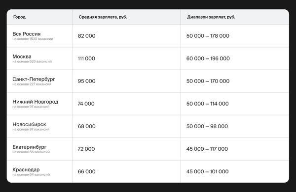 Plat seniorního specialisty začíná od 80 000 rublů v regionech a od 100 000 rublů v Moskvě a Petrohradu a dosahuje 220–250 tisíc rublů.