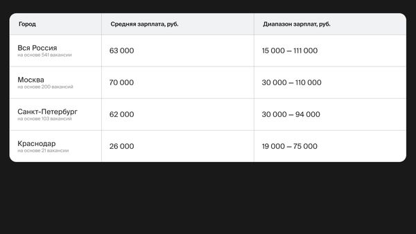 Podle hh.ru začíná plat juniorského specialisty od 25 000 rublů v regionech Ruska a od 40–60 tisíc rublů v Moskvě a Petrohradu.
