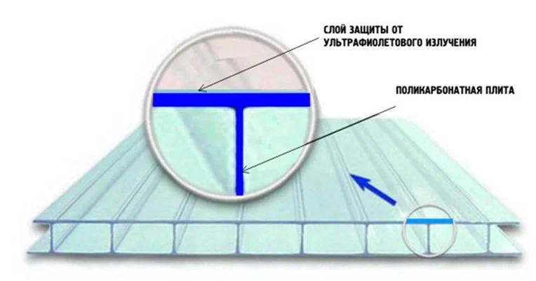 - Do hmoty plastu se přidá ochranná směs proti vyblednutí na slunci a převálcuje se. Tato metoda je levnější na výrobu, ale má hlavní nevýhodu – heterogenitu ochranné kompozice. V takovém polykarbonátu jsou místa s malým množstvím nebo vůbec bez nich a právě na těchto místech začne nejprve blednout a hroutit se.